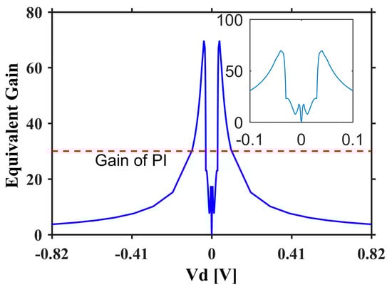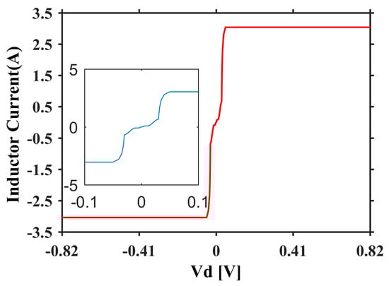 Considering only as the input with the constant OCV at 3.3 V, the equivalent gain and the corresponding inductor current are shown in Figure 10 and Figure 11, respectively. When is positively or negatively large, the equivalent gain is small to keep the inductor current under the limit. As becomes small, the equivalent gain increases. When is about 25 mV, the equivalent gain reaches its peak value of 70, corresponding to the peak inductor current of 3 A. When continues decreasing to 15 mV, the equivalent gain starts to decrease sharply to less than 20. At the same time, the inductor current declines to near zero. This prevents the divergence of the already-balanced cells. For comparison, the gain of the PI controller is shown by the dotted line in Figure 10, which has the same peak inductor current.