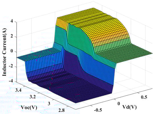 Considering both and as inputs, the inductor currents are shown in Figure 12. When is higher than 3.5 V, representing a SOC higher than 90%, the inductor current is reduced and less balancing current is charged to this cell. When is lower than 3 V (about 20% of the SOC), the inductor current is also reduced and less balancing current is discharged from this cell. This mechanism helps to protect the battery cells and potentially to extend their service life.
