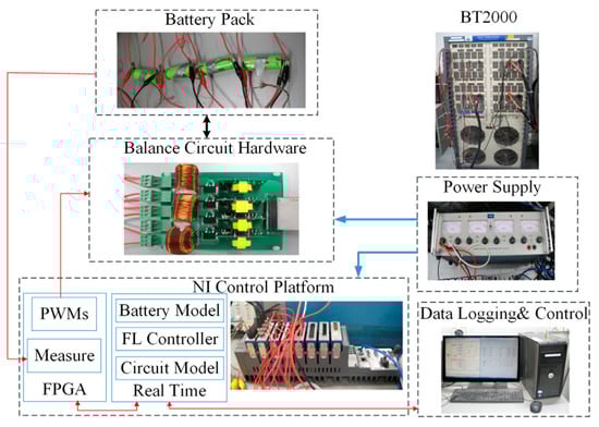 Once the balancing operation was completed, all the four cells were fully charged again with the Arbin BT2000 to evaluate the balancing effects. Figure 13 shows the performance evaluation platform for the MSIBC. In this platform, the PI controller is also implemented. The experimental results of the FL controller were compared with those of the PI controller.