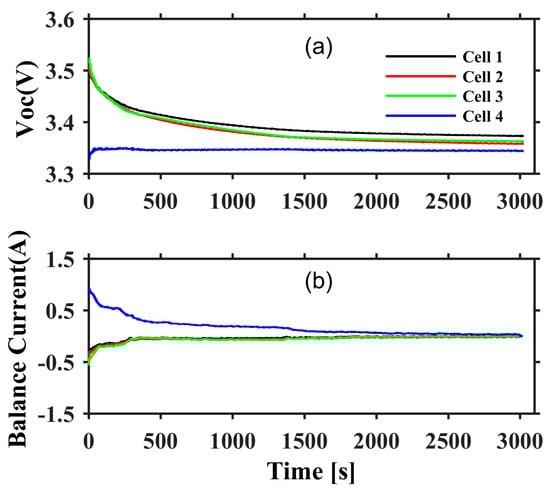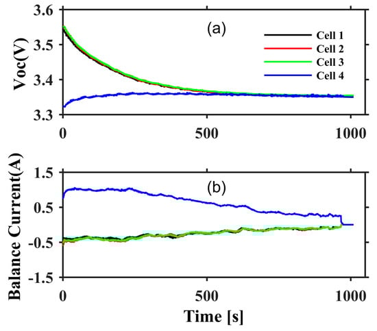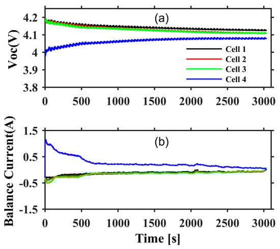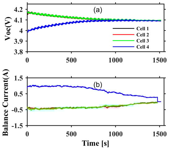 The inductor current and the mode duration decide the cell balancing currents based on Equation (1). The highest inductor current was set at 3 A, and the peak battery balancing current was 4 A. The balancing stopped when the OCV difference was less than 10 mV or the balancing time was longer than 3000 s.