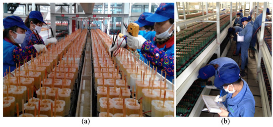 A practical battery production process: (a) Manual measurement of battery voltages; (b) Manual battery grouping.