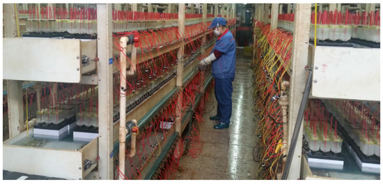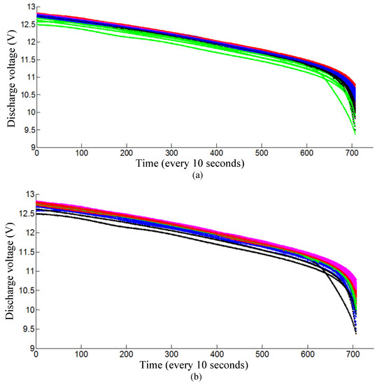 The discharging characteristic curve can well reflect the capacity and characteristic of lead–acid batteries. Taking into account the operability of the actual measurement, the charge static voltage and discharge termination voltage are widely applied for battery grouping in major lead–acid battery manufacturers in China. The charge static voltage is defined as the open circuit voltage of a fully charged battery after resting for over 24 h and the discharge termination voltage is defined as the open circuit voltage of the battery after a complete discharging procedure at a constant discharge current. As previously discussed, these two voltages do not convey all the characteristic information of the battery. In this paper, an automatic measuring device is designed to obtain the complete discharging curves of lead–acid batteries in a shelf. As shown in Figure 2, the discharge curves of 12 V lead–acid batteries on a shelf (200 batteries in each battery shelf) are automatically measured.