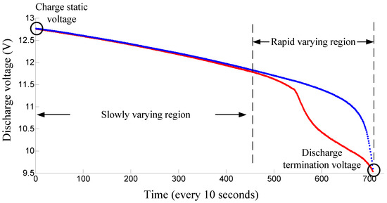 For battery grouping, battery cells should firstly be characterized before the battery grouping process. Internal resistance is widely considered characteristic of building battery packs [12]. However, it is difficult to measure internal resistance accurately. The discharging curves [13] can well reflect the capacity and characteristic of the lead–acid battery. As the important parameters of the discharging curves, the charge static voltage and discharge termination voltage [14] are widely applied for battery grouping in major lead–acid battery manufacturers of China as shown in Figure 1a. However, these two voltages alone do not fully characterize batteries.