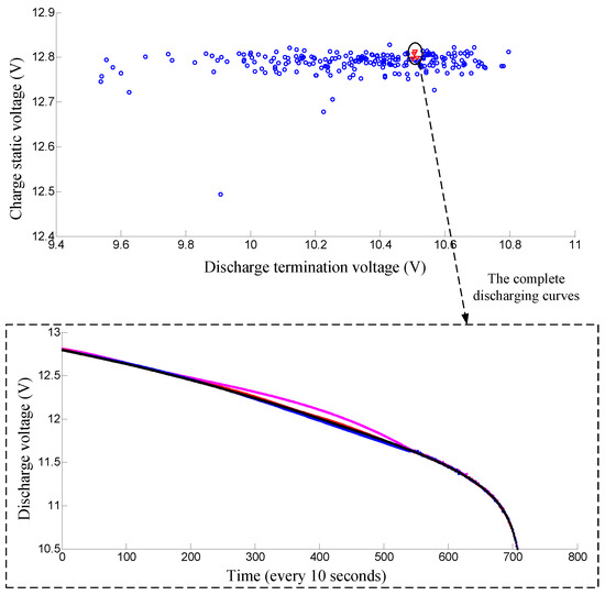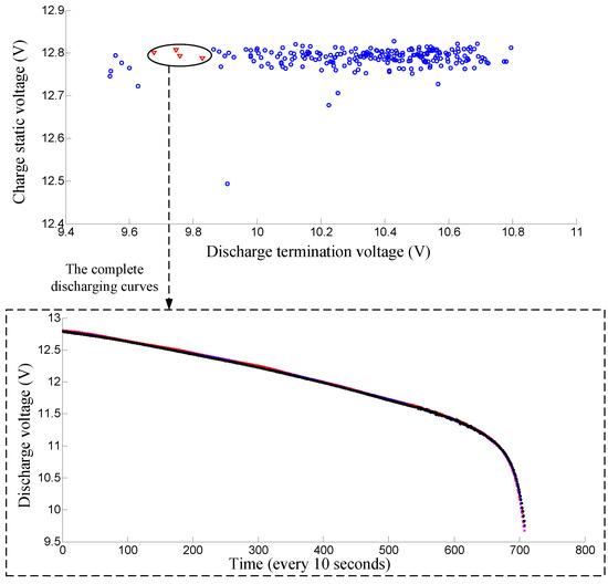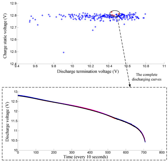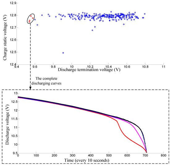 For major lead–acid battery manufacturers in China, the battery grouping process still relies on the traditional manual grouping method. Workers measure the charge static and discharge termination voltages manually with each battery and then group those batteries according to these two measured voltages. Therefore, only the charge static voltage and discharge termination voltage are firstly used as the features for grouping in our algorithm and later on compared with the new approach. The parameter k of nearest-neighbor is set to 10 in the algorithm. The charge static and the discharge termination voltages of 12 V lead-acid batteries in a shelf are plotted in a two-dimensional map. As shown in Figure 5, the first successful-grouping battery pack is displayed with triangle shape. The complete discharging curves of this battery pack are shown in Figure 5. As shown in the lower part of the figure, the discharge curves of this battery pack have great differences. To better illustrate the problem, another successful grouping example is also shown in Figure 6, we can see that the batteries in this pack have very close charge static and discharge termination voltages. However the discharges of these batteries also have big differences. Hence it is not suitable to just use the charge static and discharge termination voltages for battery grouping.