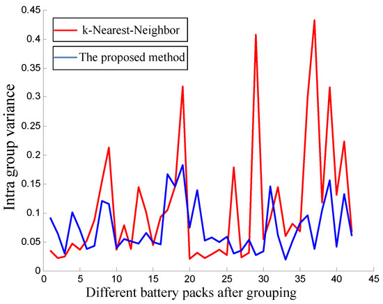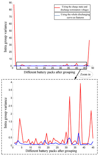 The red curve in Figure 9 represents the intra-group variances of battery packs just using the charge static and discharge termination voltages for grouping. The blue curve in Figure 9 represents the intra-group variances of battery packs using the proposed method for grouping. As shown in Figure 9 and Table 1, the proposed method using the whole discharging curve can achieve smaller variances and better intra-group consistency. In general, it is recommended to use the whole discharging curve for battery grouping instead of the traditional manual method.