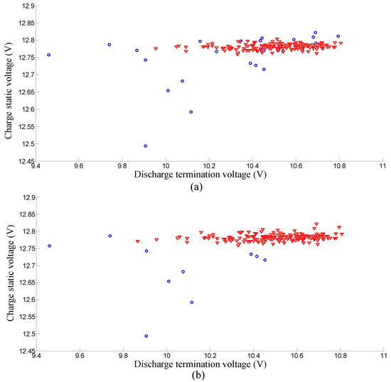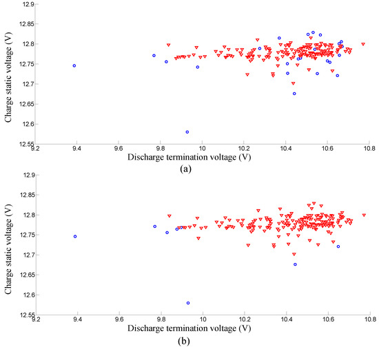 Comparison of failure amounts (): (a) Results of original k-nearest-neighbor algorithm; (b) Results of the proposed method. Note that the red triangles represent the successfully-grouped batteries and the blue circles denote those grouping-failed (“orphan”) batteries.