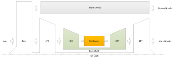 In this section, the architecture for gas path health monitoring is described based on the proposed approach. The method is applied to a twin-spool turbofan engine with high bypass ratio, which is shown in Figure 1. An aircraft engine will experience slow-evolving degradation due to usage, which is an inevitable and normal aging process. The degradation of rotary components, such as compressors and turbines, has a negative impact on flight reliability and safety if no corrective action is taken. Besides, components’ sudden machinery damages can lead the engine into an undesirable operating condition, such as a reduced compressor stall margin, or high exhaust gas temperature. Long-time degradation and these sudden damages both result in the change of component performance and characteristics, such as capacity and efficiency. Thus the flow capacity and efficiency of engine components are chosen as “health parameters” to reflect component health performance. The normalized degradation of health parameters is described as