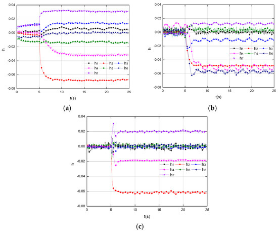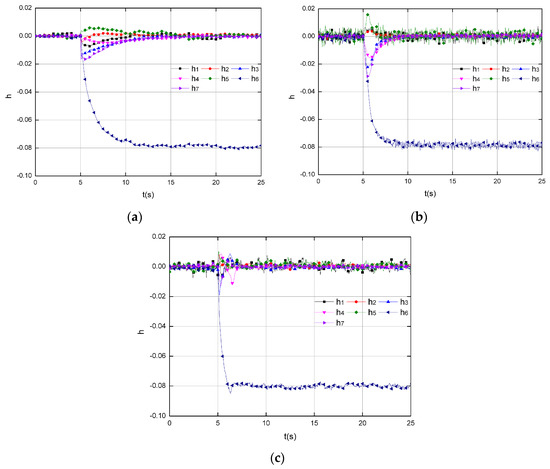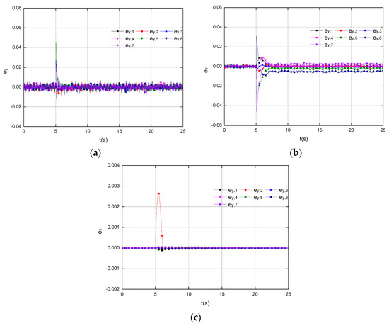 The output errors corresponding to the injected 6% decrease on , 2% decrease on and 2% increase on , that is applied at s (Mode 5) in scenarios with uncertainties. (a) Results by KF; (b) Results SMO; (c) Results by SOSMO.