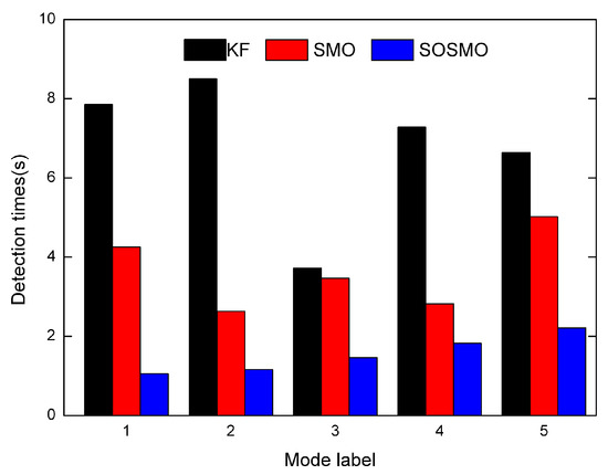 Figure 5 depicts the average detection times for each fault mode (Mode 1 to 5). It can be seen that the SOSMO consumes less time compared to the other two tools. This is because both the KF and the SMO work as state-estimator, and health parameters are modeled as state variables, the dynamics of which are assumed to be non-exist. That is to say the health parameters are expected to be slow evolving, which implies the KF and SMO schemes are not suitable for rapid fault cases. For SOSMO method, health parameters are modeled as unknown inputs, and the estimation is implemented by “fault reconstruction” concept. That means the SOSMO scheme have no limit on health parameters’ dynamics, which explains the ascendency of SOSMO in detection times.