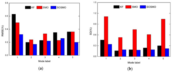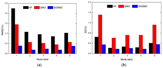 where and are the start point and the end point of the testing sequence, respectively. is the value in the sequence of the mth health parameter, and is its estimation value. From the definition, the RSME represents the precision of the estimation, while the SD reflects the dispersion degree. Figure 6 shows the statistics reflecting the averaged RSME and SD of seven health parameters in each fault mode. The RMSE results consistently imply the ascendency of the sliding mode observer in accuracy, while the SD results show the system chattering in sliding modes is well controlled to an acceptable level.