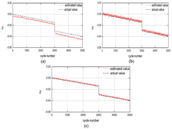 The health estimation corresponding to the injected 4% decrease on that is applied over 5000 cycles (Mode 6) in scenarios with uncertainties. (a) Results by KF; (b) Results by SMO; (c) Results by SOSMO.