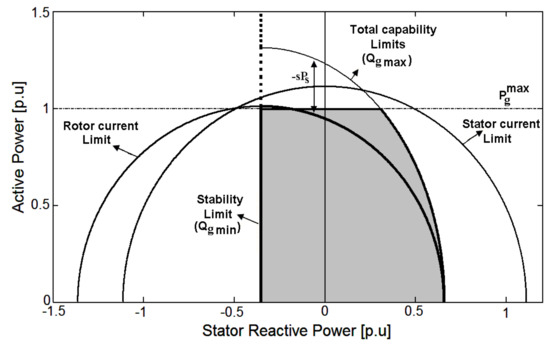In conventional operation, the active power generated by the DFIG has a given value that depends on the wind speed and the power curve of the turbine. However, the DFIG reactive power can be controlled between the limits shown in