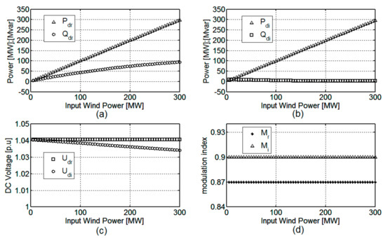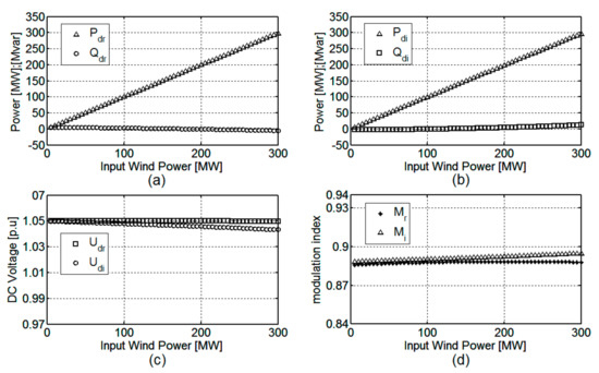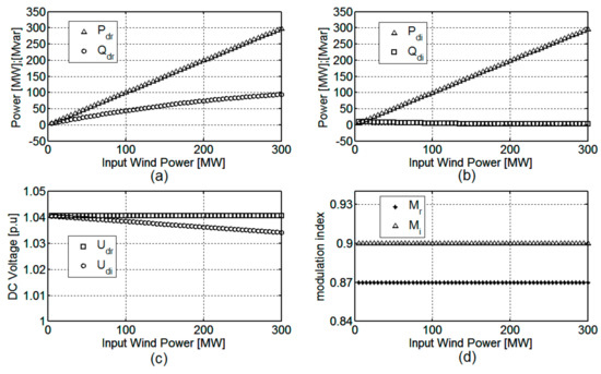 Figure 11c,d show the DC voltage at the VSC-HVdc and the modulation indexes. These values are set to the optimal values to minimize the losses at the HVdc link. Finally,