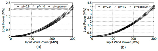 Figure 12 shows the power losses at both the OWF and OWF+VSC-HVdc links. In both cases, losses are reduced when the optimal operation is employed versus operation at a fixed power factor. In the optimal operation, the power factor is set independently at each wind turbine in order to minimize losses.