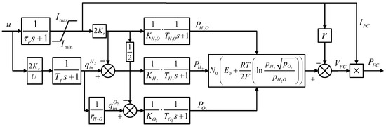 where , and are the pressure of hydrogen, oxygen and water, respectively. And denotes the reference current from controller, denotes the net power, denotes the net voltage and denotes the net current.