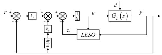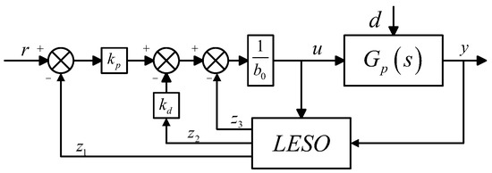 As mentioned above, , , are designed to track y, , f respectively. The core concept of LADRC is to approximate the entire system to a nth-order differential equation through estimating the system external and internal disturbance. Based on this approximation, PD control law can be easily designed to control the complex system. Although the expended state observer is proved to be stable in the long term, there still exists estimation error of state variables at the beginning of controlling process, which can adversely affect the controller performance. Therefore, it is of significantly practical and theoretical necessity to reduce the error of estimation. This paper recognizes that the LESO output and , which respectively track the state y and , can be directly replaced by the system output y and the differential of y and the structure is as Figure 5. That is, the control law of (22) is replaced by (24). During this controlling process, the negative effect of the estimation error of and is avoided and the parameters only need to minimize the estimation error , which reduces the stress of linear extended state observer and increases estimation accuracy. This modification can avoid the influence of estimation error of and .