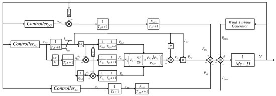 For the purpose of releasing the variable-speed WTG inertia and sharing the resultant energy to the grid following the grid frequency oscillation, a method about inertia control [24] is put forward, in which a supplementary control loop is added to enhance the response speed according to grid frequency deviation. The variable-speed wind turbine generator model with supplementary control loop is described in Figure 3 and parameters value used for simulation are shown in Table 3 [24]. The supplementary control loop adds an extra power as soon as frequency deviation is detected in the power grid. And is the contribution coefficient of wind turbine generator in system frequency regulation. According to Figure 3, with the increasing of the value of , the output power of wind turbine generator will increase, which improves the frequency dynamics of power system. And this paper sets to a fixed value 4 to compromise relative improvement of frequency regulation and prevention of the system instability.