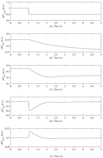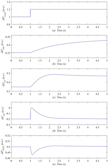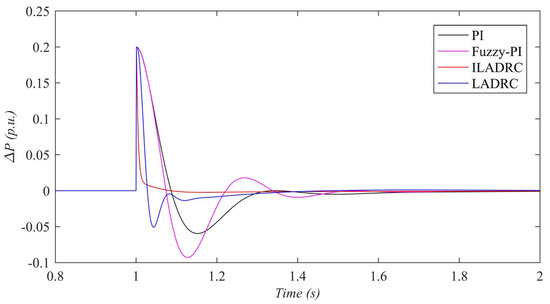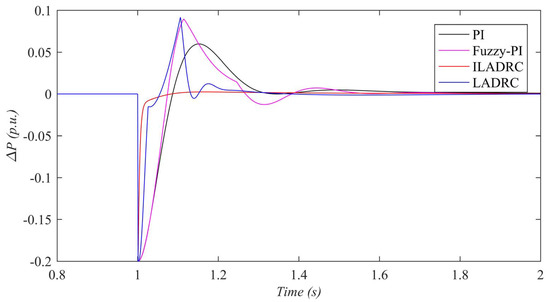 After the load demand decrease of 0.2 p.u. at 1 s, the transient response of system power exchange and system frequency deviation are described in Figure 9 and Figure 10, respectively. The comparison results of ILADRC, LADRC, PI and Fuzzy-PI are shown in Table 7. With load demand decreasing, the overshoot value of ILADRC controller is −0.0074 Hz, which is considerably better than −0.0192 Hz, −0.0525 Hz and −0.0525 Hz derived by LADRC, Fuzzy-PI and PI controller, respectively. It can be obviously found that the settling time of frequency regulation based on ILADRC controller is reduced to 0.184 s and the sum of value of ITAE and RoCoF is reduced to 0.0303. All the simulation results declare the excellent performance of ILADRC controller. And the transient power responses of each energy sources based on ILADRC controller are depicted in Figure 11b–e. The simulation results with +0.2 p.u. change of load demand at 1 s are shown in Figure 12, Figure 13 and Figure 14 and Table 7, the analyses are the same to the above and this paper is not going to analyze them again.