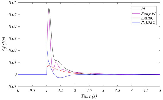 Furthermore, this paper researches the circumstance with stochastic power of wind turbine generator and +0.2 p.u. change of load demand at 1 s. The simulation results are presented in Figure 20 and Table 9. It is easy to observe that the performance of ILADRC controller is better than others. Its overshoot −0.0127 Hz and ITAE 0.0131 are both better than those with LADRC, Fuzzy-PI and PI. However, the value of RoCoF is meaningless because the stochastic characteristic of wind power can cause tremendous variability of frequency and power.