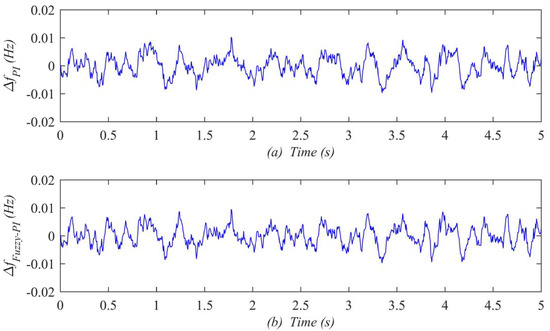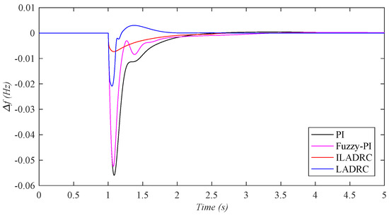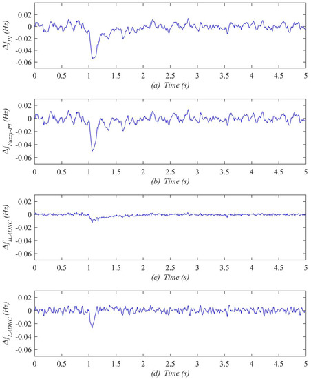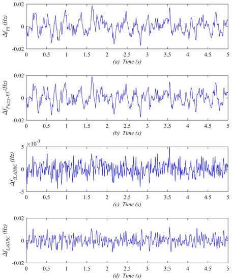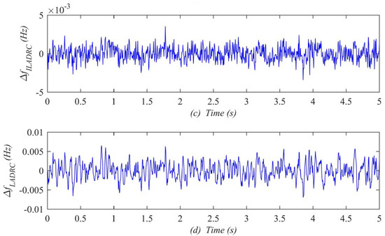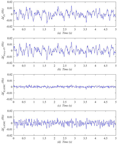 Transient response of system frequency deviation under stochastic power output of wind turbine generator. (a) Frequency deviation with PI controller; (b) Frequency deviation with Fuzzy-PI controller; (c) Frequency deviation with ILADRC controller; (d) Frequency deviation with LADRC controller.