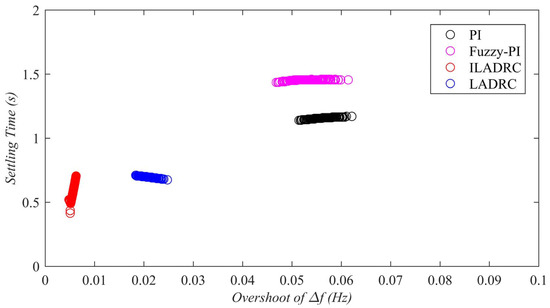 Based on the aforementioned system model and control strategy, this section studies the robustness capability of ILADRC algorithm. The complexity and uncertainty of the microgrid composition determines that the parameters of the microgrid system may vary within an uncertainty range. And if the controller is difficult to deal with the variety of parameters, undesirable challenges and even collapse will be encountered. Consequently, it is of great importance to evaluate the ability of the system to tackle this situation. As previously analyzed, Monte-Carlo experiment is carried out to verify the robustness of system. With system parameter M and D variation within 10% for 200 times, the simulation results are presented in Figure 21. The changes of system with the ILADRC approach is almost negligible. However, traditional LADRC, Fuzzy-PI and PI based system have wider distribution. The result indicates that the ILADRC has better robustness capability.