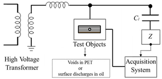 In this research, the PD measurement circuit employed is in accordance with the IEC 60270 standard [28]. The HV AC test system is made up of a HV transformer, over voltage protection, current/voltage regulating devices, an AC measurement capacitor (C1) of 1 nF, partial discharge free up to 100 kV, used as a low impedance path for PD pulses, a measurement impedance (Z) used for the HV AC signal measurement, and the PD acquisition system. A schematic diagram is shown in Figure 1.