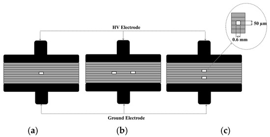 - Serial void (void 3): This test arrangement is also similar to void 1, except that two voids with the same sizes (i.e., D = 0.6 mm and t = 50 µm) are created adjacent to each other in a vertical form as shown in Figure 3c. The inception voltage is approximately 2.82 kV. It can be seen that the inception voltage for void 2 is greater than that of void 1 and void 3 due to the influence of the electric field on the different void arrangements.