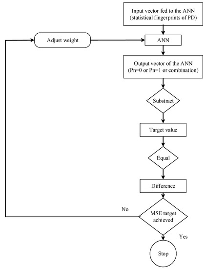 An example of the learning process in an ANN applied to the identification of PD is shown in Figure 4. In this context, the input vectors are the statistical fingerprints derived from different PRPD patterns and the outputs are a combination of 0 s and 1 s to differentiate the PD. The ANN can have many layers and normally has sigmoid functions in the hidden layer. The sigmoid function is the most commonly used function in the construction of the ANN because of its asymptotic properties and can normally squash input parameter to a range 0 to 1 [30]. There is no certain criterion for selecting the number of neurons in the hidden layer, but enough neurons are needed to obtain a very good performance [17]. Generally, in designing and training the ANN, certain considerations have to be taken to be able to get the best result, i.e., by choosing the number and types of neurons in the hidden layer and finding the best solution to avoid local minima in the error space [29]. Local minima are a sudden termination of the training error curve resulting from instability of the ANN [29].