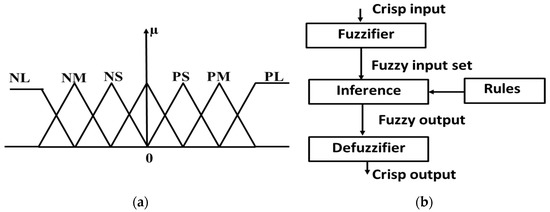 Figure 5a shows an example of MF, where the classes are numbers that are negative large (NL), negative medium (NM), negative small (NS), close to zero, positive small (PS), positive medium (PM) and positive large (PL). µ refers to the membership in a particular class or set. A FL comprises of four fundamental parts [36]: fuzzifier, rules, inference engine, and defuzzifier, as shown in Figure 5b. The fuzzy logic algorithm is as follows: