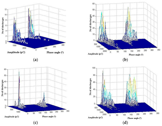 For tests involving a point to ground on pressboard in oil (Figure 8a–d), the applied voltage, gap distance and angular positioning of the point discharge source play a significant part in the PD repetition rate and oil-pressboard degradation process. Although the PRPD pattern shown illustrates only the initial degradation, it is clear that the higher the applied voltage, the higher the discharge intensity. From the experiment, it was observed that distinguishing aspect between 25 mm and 45 mm point-ground gaps on pressboard in oil is the spread of the tracking marks on the pressboard surface due to sustained intense PD. This result is an indication of variability in the PD patterns and statistical fingerprints defining the surface discharge in oil.