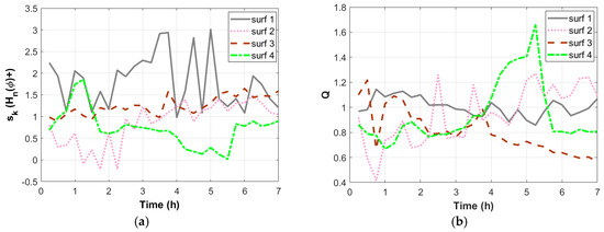 Statistical variation of surf 1, surf 2 and surf 3 and surf 4 (a) sk (Hn(φ)+) and (b) Q.