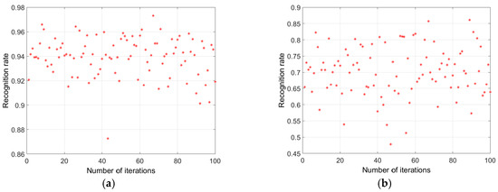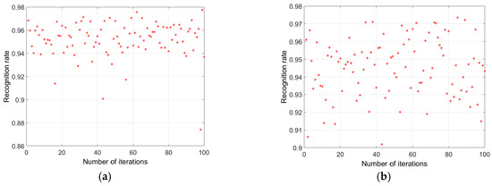 Figure 12 shows examples of varying recognition efficiencies when any of the void samples (single, serial or parallel) is applied for training the ANN and other void samples utilized for testing. The result clearly indicates that for ANN trained with the similar PD statistical sample, higher average recognition rate with lower variance has been observed, while for the ANN trained with one void sample and test with another sample, higher variance of recognition rates with lower variance is observed. Similarly, results for training and testing with different surface discharge samples are shown in Figure 13. To further evaluate Figure 12 and Figure 13, average recognition rates of different training and testing permutations are shown in Table 2. The results show that patterns of single and serial void are approximately similar with recognition efficiency of up to 98%, which is different from a parallel void. This result clearly correlates with the statistical variability of the voids (Figure 10) and the respective PD patterns (Figure 7). From this result, it can be established that when training the ANN with any of the three void arrangements considered in this paper and testing with others, high recognition probability is attained up 70%, which is enough to reveal that they all belong to the same defect, though with different geometry or arrangement. This result further demonstrates, though the single and the parallel void have similar PD characteristics such as the inception voltage, PD magnitude among others but they vary in terms of the PRPD distributions.