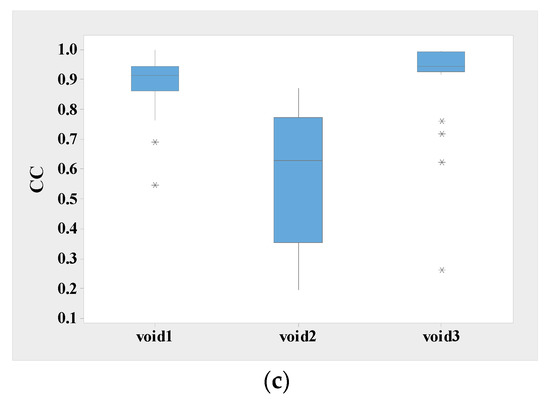 Comparison of quartiles for different statistical parameters for voids: (a) sk of the pulse height distributions; (b) Q and (c) cc.