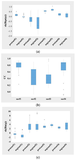 Comparison of quartiles for different statistical parameters for surface discharges: (a) sk of the pulse height distribution; (b) cc, and (c) sk of the Hn(q).