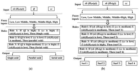 Structure of the Fuzzy classification system for (a) voids; and (b) surface discharges in oil.