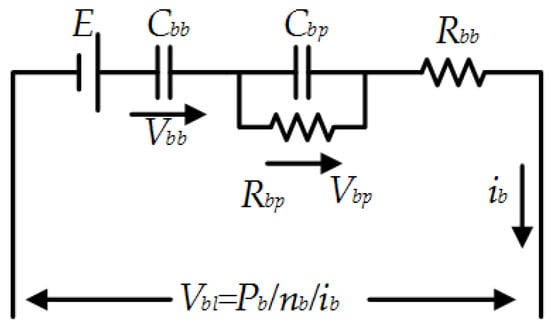 In the PNGV model, E and Vbb approximate the voltage source of the LiB, in which E is a constant evaluated as the open circuit voltage (OCV) value when the LiB is fully discharged. Vbb represents a linear relationship between the variation of source voltage and variation of remaining source energy, just like a capacitor approximately, and Cbb is corresponding capacity. Cbp and Rbp reflect the electrode polarization phenomenon; Rbb is the equivalent dc resistance. Vbl is the cell terminal voltage, Pb is pack power, nb is cell number in pack.