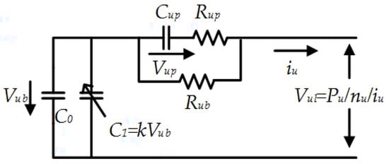 The equivalent circuit of the UC is shown in Figure 3 [4]. This model consists of two parts: the part for main energy storage (C0 and C1) and the part reflecting electrode kinetics (Rub, Rup and Cup). In the main energy storage part, C0 and C1 are connected in parallel. C0 is characterized by constant capacitance, and C1 is characterized by capacitance varying linearly with the voltage Vub. They characterize the nonlinearity of the source jointly. In the electrode kinetics part, Rub represents the Ohmic resistance, while Rup and Cup represent polarization resistance and polarization capacitance separately.