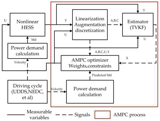 As AMPC solves the QP problem with the assumption that measured disturbances in the prediction horizon are known, the velocity needs to be predicted. Yet, model prediction inevitably causes errors, and the predicted power demand wouldn’t improve AMPC efficiency, and sometimes it may even deteriorate the efficiency if the velocity prediction is not that accurate. As a result, current power demand is applied to AMPC, and remains unchanged in prediction horizon. The whole process of the AMPC is shown in Figure 4, in the red box is the AMPC.