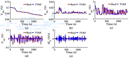 States values estimated by TVKF of AMPC. (a) Vbb estimation; (b) Vbp estimation; (c) Vub estimation; (d) Vup estimation; (e) ib estimation.