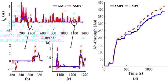 Figure 8 shows the SMPC and AMPC comparison for ib, Figure 8b,c is zooms of Figure 8a. In Figure 8b, the LiB current of SMPC is charging and discharging dramatically, which is not observed in AMPC. In Figure 8c, the LiB current of SMPC is fluctuating remarkably around 0 when HESS is charging. Furthermore, the LiB current of SMPC distinctly goes beyond that of AMPC. All the situations mentioned above lead to an increase of LiB Ah-throughput, as shown in Figure 8d. The phenomena indicate that time-varying prediction model matrices as well as accurate state estimation by TVKF significantly improve accuracy of control action calculated by QP solver of AMPC. Besides, as SMPC isn’t able to estimate states precisely, the constraints on Vub and yu may be violated, resulting in SMPC failure, which will cause damage to HESS.