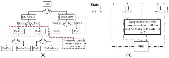 The RBC process is shown in Figure 10a, in which Pd and USOC are inputs, Pb is the output. Pb,avg represents the average power delivered by LiB, Pb,char represents the complementary power supplied from LiB to UC to maintain adequate energy for coming peak power demand. Both of them are tuned and keep constant for all driving cycles. Hysteresis control is shown in Figure 10b, which is designed for preventing USOC from frequent fluctuation round the bounds. The USOC range for hysteresis control is determined based on the UC capacity. As the capacity increases exponentially with USOC, the upper range could be set smaller compared with the lower range. Besides, considering the DC bus voltage constraint, the upper range is chosen as [0.9, 0.92], the lower range is chosen as [0.54, 0.59].