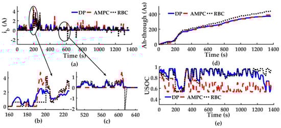 The results of AMPC, DP and RBC are shown in Figure 12, in which 12b and 12c are zooms of 12a. Figure 12b shows ib of three EMSs under a continuous peak power demand which lasts for about 20 s. With the peak demand, optimal ib of DP changes gradually and magnitude is satisfactory, for peak power demand is known in advance. While, ib of AMPC is almost 0 at first to avoid the increase of LiB Ah-throughput, and gradually increases when USOC is about to fall to the lower bound to avoid violation. Though the ib of AMPC is relatively larger, the duration is shortened significantly by QP solver compared with DP and RBC, and the LiB Ah-throughput is reduced through the simulation greatly, indicating excellent flexibility and adaptation of AMPC. LiB current ib of RBC keeps nearly constant at first for Pb keeps at Pb,avg to maintain USOC. At about 200 s, a sudden change in ib appears when USOC reaches the lower bound, as shown in Figure 12e. This indicates that RBC is rigid in handling operation mode transitions caused by constraints, and adjustment of USOC by constant Pb,avg is poor. In Figure 12a, ib of DP and AMPC remain nonnegative, while with RBC, LiB charges several times. One of the phenomena is shown in Figure 12c. Referring to Figure 12e, and we can find that the situation appears due to USOC reaches upper bound, again indicating that constant Pb,avg can’t adjust USOC flexibly to leave a margin for the braking energy. Consequently, frequent charge obviously increases LiB Ah-throughput, as shown in Figure 12d. As AMPC minimizes ib, energy in UC is always utilized firstly, and USOC always leaves a margin for braking energy, charging to LiB hardly appear. When the power demand is 0, LiB outputs a very small current to UC with DP, which adjusts USOC to deal with peak power demand. Though RBC designs Pb,avg to simulate this action, Pb,avg of RBC can’t be real-time optimized based on future demand as well as control target. In Figure 12e, USOC of AMPC fluctuates mainly at the bottom of the range, whereas USOC of RBC fluctuates mainly at the top of the range, again revealing that with AMPC, HESS can take better advantage of UC as a buffer, and absorb more braking energy to reduce LiB Ah-throughput. As a result, when encountering changing driving conditions, AMPC makes the best use of UC as a buffer, while ensuring UC voltage remains within its range, revealing considerable flexibility and adaptivity. Conversely, RBC is rigid in managing bound problems, meanwhile Pb,avg can’t be adjusted for real-time, RBC adaptability is poorer and the result is not optimal compared with AMPC.