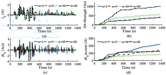 Simulation results with different w7. (a) LiB current; (b) LiB Ah-throughput; (c) LiB current rate; (d) Accumulated LiB current rate.