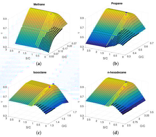 By looking at the conversion efficiency maps, a similar trend can be recognized as well. Also in this case, as for the temperature, a surface slope somehow related to the number of carbon atoms present into the fuel is observable. In Figure 3, the conversion efficiency maps with the subset of working points fulfilling the constraints and, again, the unusable carbon deposition area are depicted.