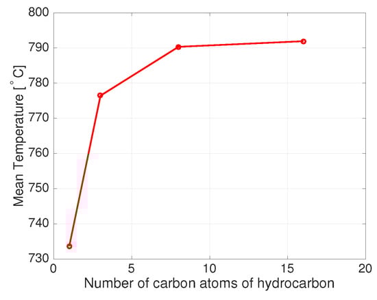 In order to justify the impossibility to find an operating point at 750 C for methane, the maximum ATR equilibrium temperature for all of the hydrocarbons in the subset of admissible working points can be evaluated, and a curve where the maximum temperature is depicted as a function of the number of carbon atoms of the fuel can be built.