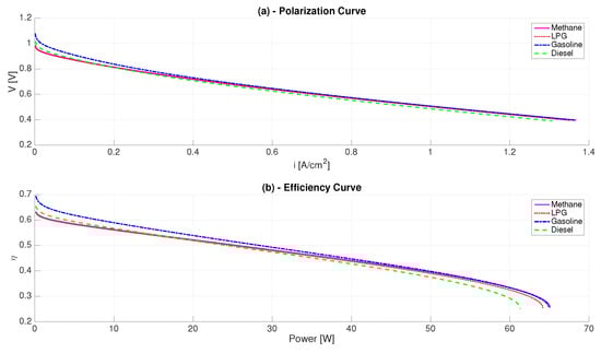 With respect to Table 3 and Table 4, two sets of polarization curves have been obtained, one referred to as an ATR operating temperature of 700 C, where all four considered fuels are present, and one related to 750 C, where only three fuels can be used, it being impossible to find an operating point for methane. More specifically, Figure 5 shows the polarization and the power curves obtained for the lower temperature level, while in Figure 6, the same curves obtained with the higher temperature level are depicted.