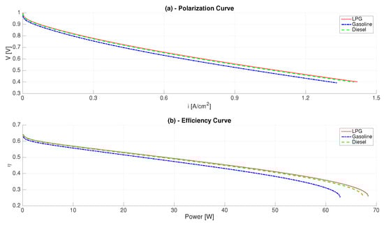 Things change for the 750 C case. In fact, as one can note in Figure 6, now the gasoline-derived syngas is the one with the lowest efficiency, and this reflects on the average fuel cell efficiency portrayed in Figure 9. Moreover, when the state of charge drops below 30%, the fuel cell is run at the maximum load in order satisfy the driver’s power demand and sustain the state of charge or even recharge the battery. Since the maximum power of the gasoline-fueled FC is the lowest, the mission performed with this fuel is characterized by a final state of charge lower by 6–7% points than the other fuels. This obviously reflects on the fuel consumption, which is 10.86 g/km for gasoline-derived hydrogen against 10.78 g/km for diesel-derived hydrogen and 10.72 g/km for LPG-derived hydrogen, in the case of 750 C.