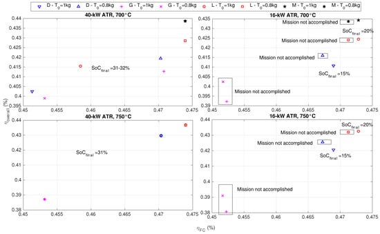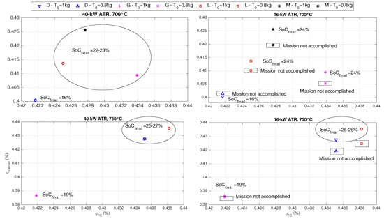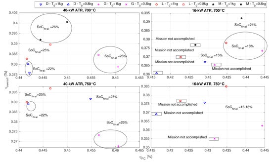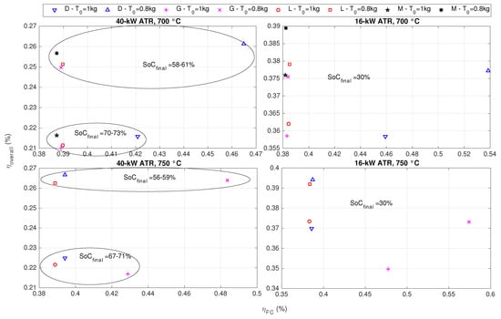 In [20], it has been seen that, in terms of fuel consumption, ending the driving cycle with a final state of charge () higher than 30% is more penalizing than ending the driving cycle with a charge sustaining operation. As one can note in Figure 8, in fact, the 40-kW ATR results in being oversized, and the controller is not able to discharge the battery. This is because the fuel cell is frequently forced to run alone to discharge the buffer, decreasing the fuel cell average efficiency and therefore the system overall efficiency (the system average overall efficiency is evaluated as the ratio between the total energy required by the traction motor and the sum of the input energies: battery energy and hydrocarbon fuel chemical energy). The higher the final state of charge, the lower the average overall efficiency is; therefore, an initial tank level of 1 kg further penalizes the system, as the fuel cell must be more frequently used. For the 16-kW ATR, the controller is always able to complete the driving mission with a 30% final , but again, the overall efficiency is higher when the tank level is initially equal to 0.8 kg. In particular, the overall efficiency is higher by more than 10 percentage points with respect to the 40-kW ATR scenarios. Setting a 700 C temperature for the reactor includes the possibility of using methane, but slightly decreases the efficiency of the system for the other fuels, even if never more than two percentage points.