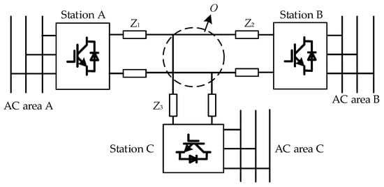 In Figure 1, areas A, B and C represent three asynchronous AC power grids. Point O is a node of the DC power grid. The multi-terminal DC power grid adopts overhead lines. These lines choose aluminum cable steel reinforced (ACSR)-720/50 with R = 0.04 (Ω/km), and adopt a four-splitting lead. The distances of OA, OB and OC are 100 km, 80 km and 40 km, respectively. The resistances of each line are: