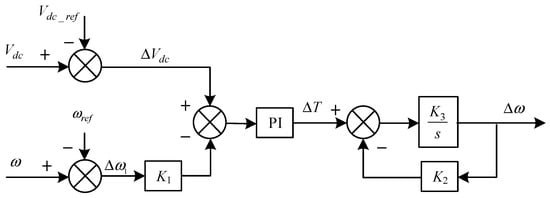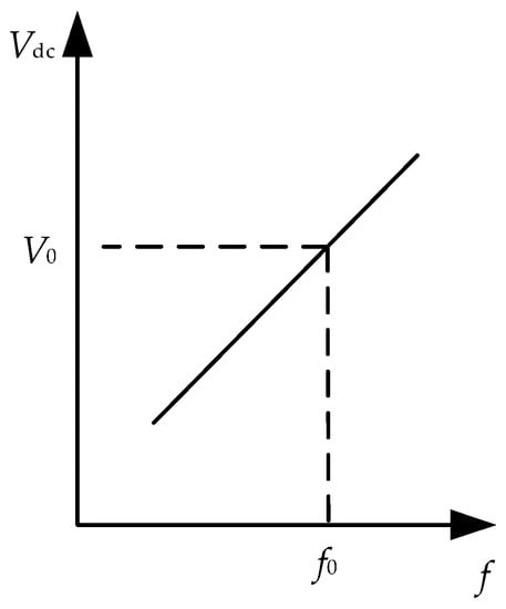 Based on the analysis above, this paper proposes a control method. It puts the converter DC voltage and AC frequency in a positive relationship, as shown in Figure 6. In addition, to make the converter automatically sense frequency fluctuations of the AC system and supply energy to AC grids, the converter should make the AC frequency as feedback in the outer control loop. The virtual inertia is introduced in the control strategy, which makes the converter achieve dynamic power sharing, as for the traditional synchronous generator when a load disturbance occurs in the AC system [26,27]. Additionally, to ensure that the converter has the ability to support DC voltage, the converter should also make DC voltage a feedback in the outer control loop. The control loop is shown in Figure 7.